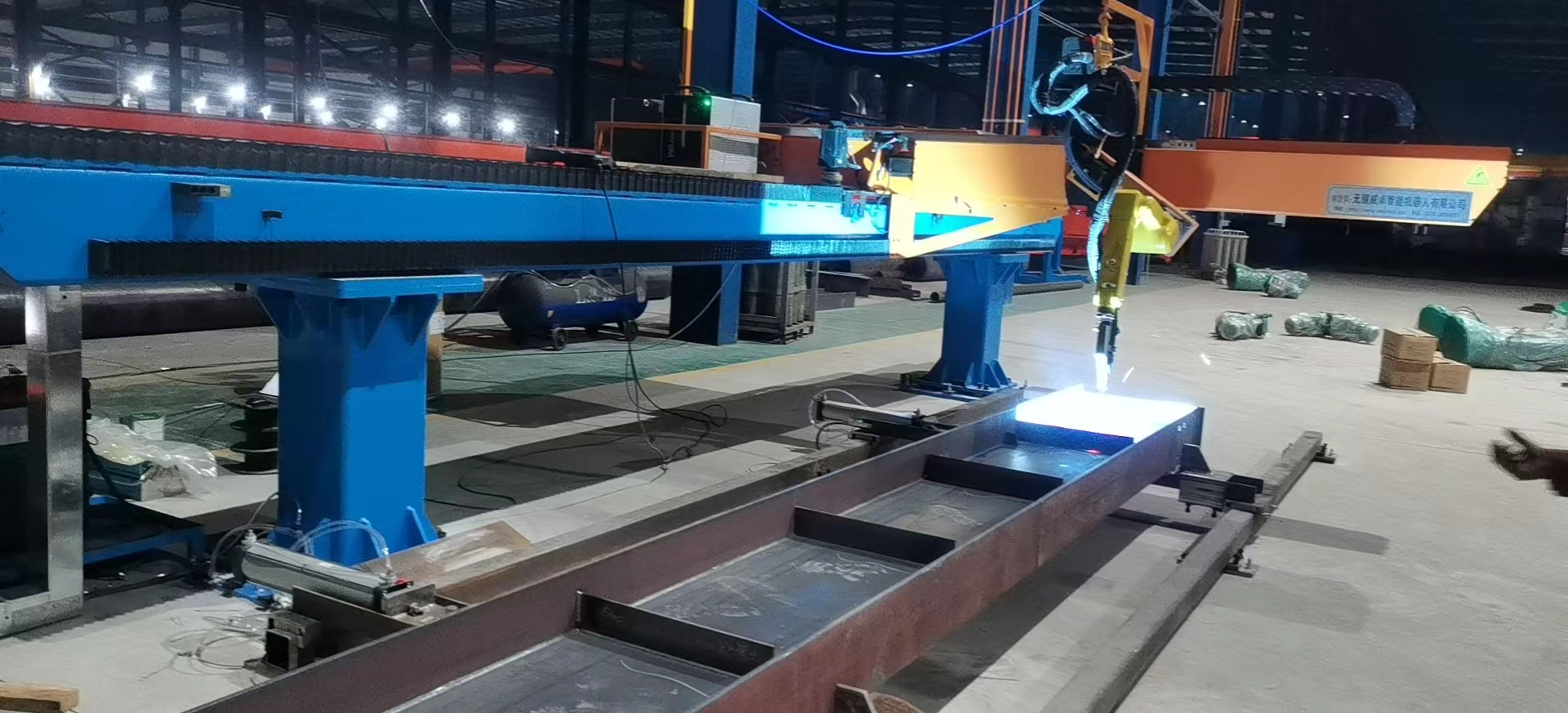 智能焊接在鋼構(gòu)行業(yè)的成功應(yīng)用針對(duì)鋼結(jié)構(gòu)中常見(jiàn)的H型鋼等鋼梁工件,威卓設(shè)計(jì)研發(fā)了小龍門智能焊接工作站,焊槍部分使用鋼梁專用焊槍,更適用于鋼梁焊接;搭配傳感器使用,自動(dòng)尋位識(shí)別焊縫,無(wú)